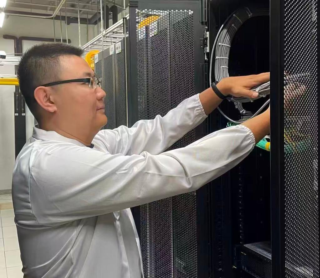 中国移动呼和浩特数据中心算力网络运维工程师赵一帆正在进行设备线缆检查。(受访者供图)